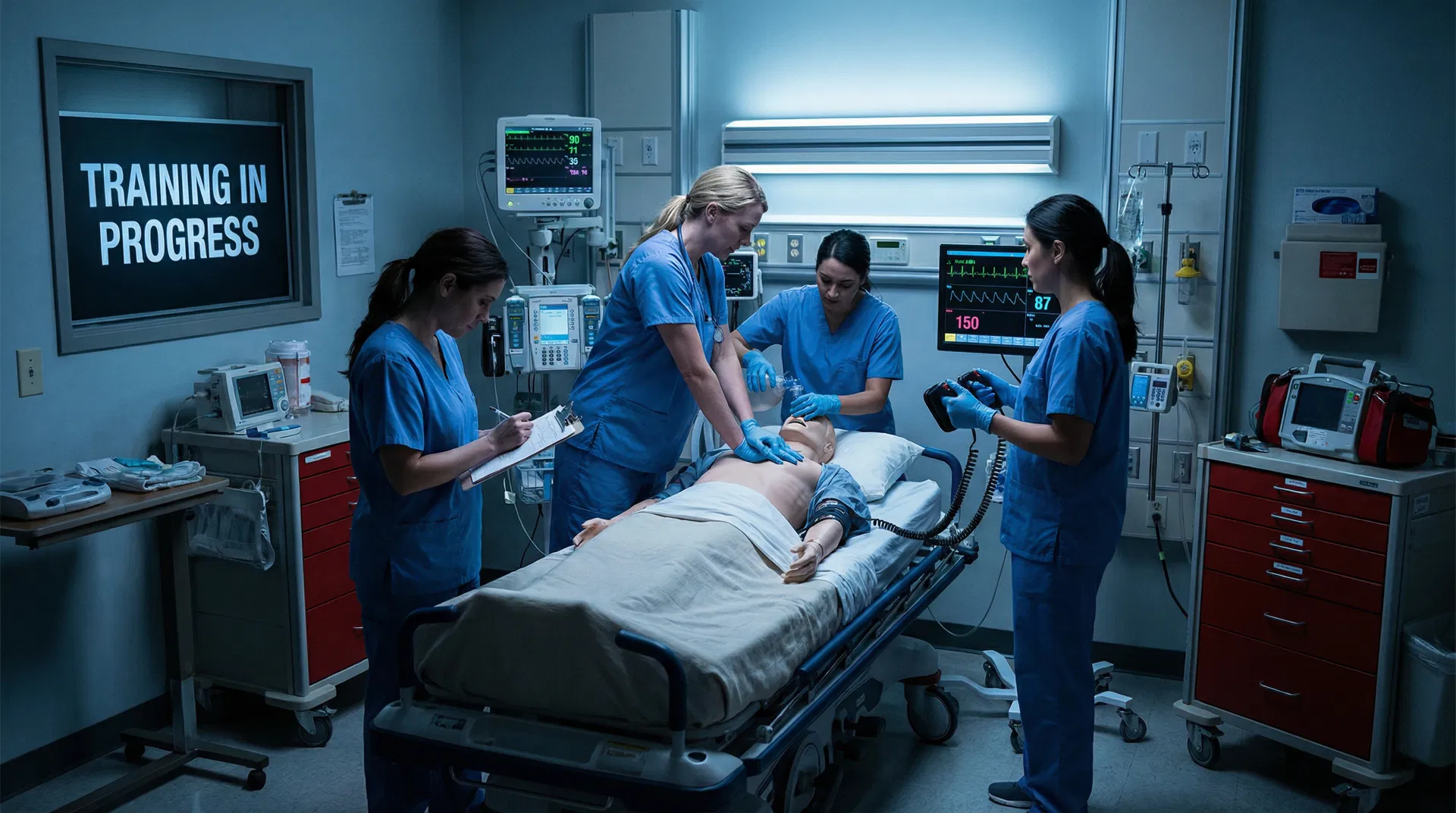 Execução assistencial real. O profissional executa corretamente através de simulação realística e cenários clínicos de PS, UTI, UPA e APH.